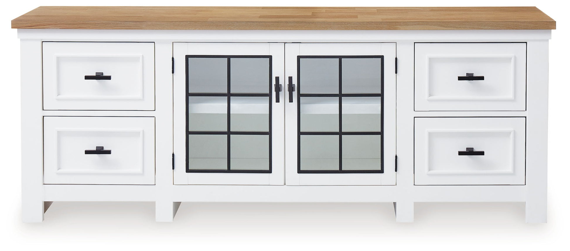 Casual style with substance. This two-tone TV stand raises the bar on comfortably cozy design. A sturdy silhouette with a butcher block oak veneer top, classic white finish and contemporary black metal hardware exudes modern farmhouse vibes. The spacious cabinet, display shelves and drawers let you tuck away entertainment essentials while displaying treasures in this charmingly curated piece. Cutouts for wire management help keep the look relaxed and uncluttered.