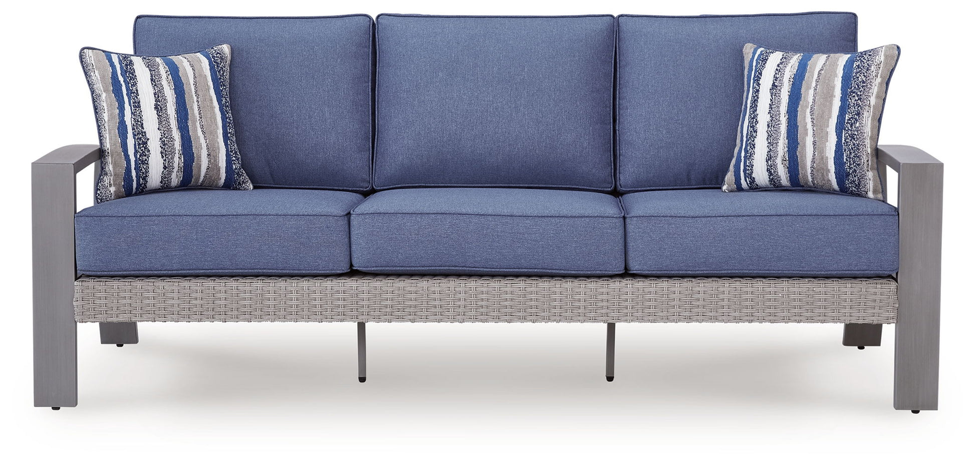 High style crafted for low-maintenance living. Turn your outdoor space into a sweet retreat with this sofa. This casually cool piece entices in an easy-breezy gray resin wicker over an all-weather aluminum frame, for an upscale aesthetic that’s downright durable. Plush seat cushions wrapped in high-performance Nuvella® fabric are indulgently comfortable yet so easy to maintain. Accent pillows add delightful flair.