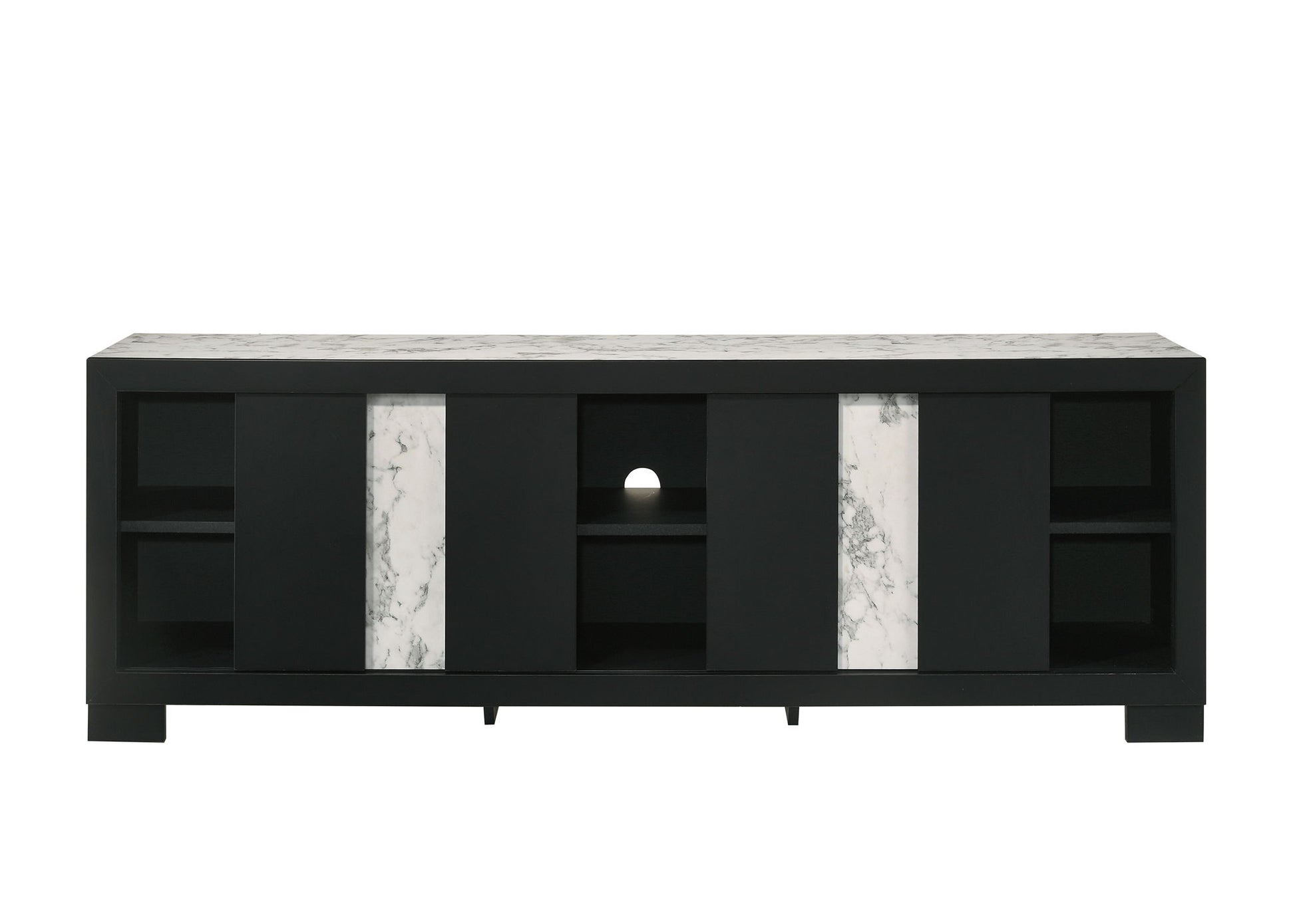 This sleek and modern entertainment unit is the epitome of contemporary elegance and functional design. Boasting a bold finish with striking marble-like accents, this piece serves as a captivating centerpiece for any living space. Its generous surface perfectly accommodates large screen displays, while the ample storage space including open shelving and discreet cabinets provides a neat solution for all your multimedia devices.